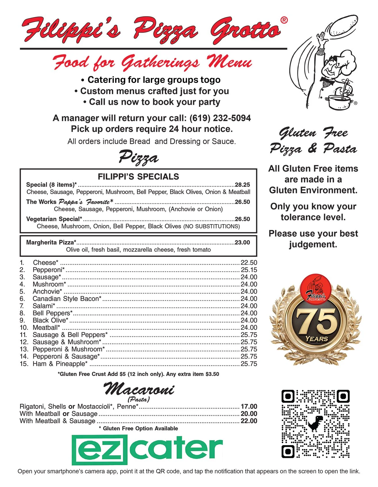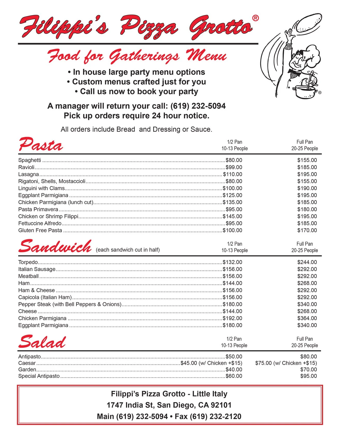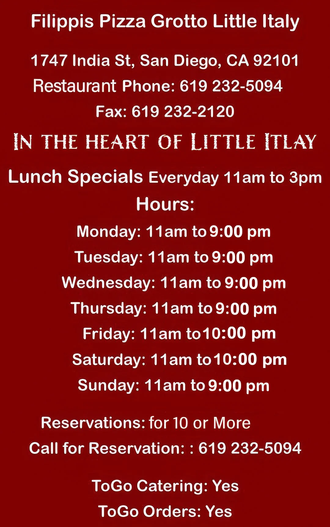 Filippis Pizza Grotto, San Diego, Little Italy, West Covina, Santee, Poway, Jamul, Napa, Chula Vista, Escondido, Kearny Mesa, Mission Gorge, Norco, Pacific Beach, Scripps Ranch, Mira Mesa, Imperial Beach, Temecula, Pizza, Spaghetti, Ravioli, Lasagna, Macaroni, Sandwiches, Antipasto Salad,