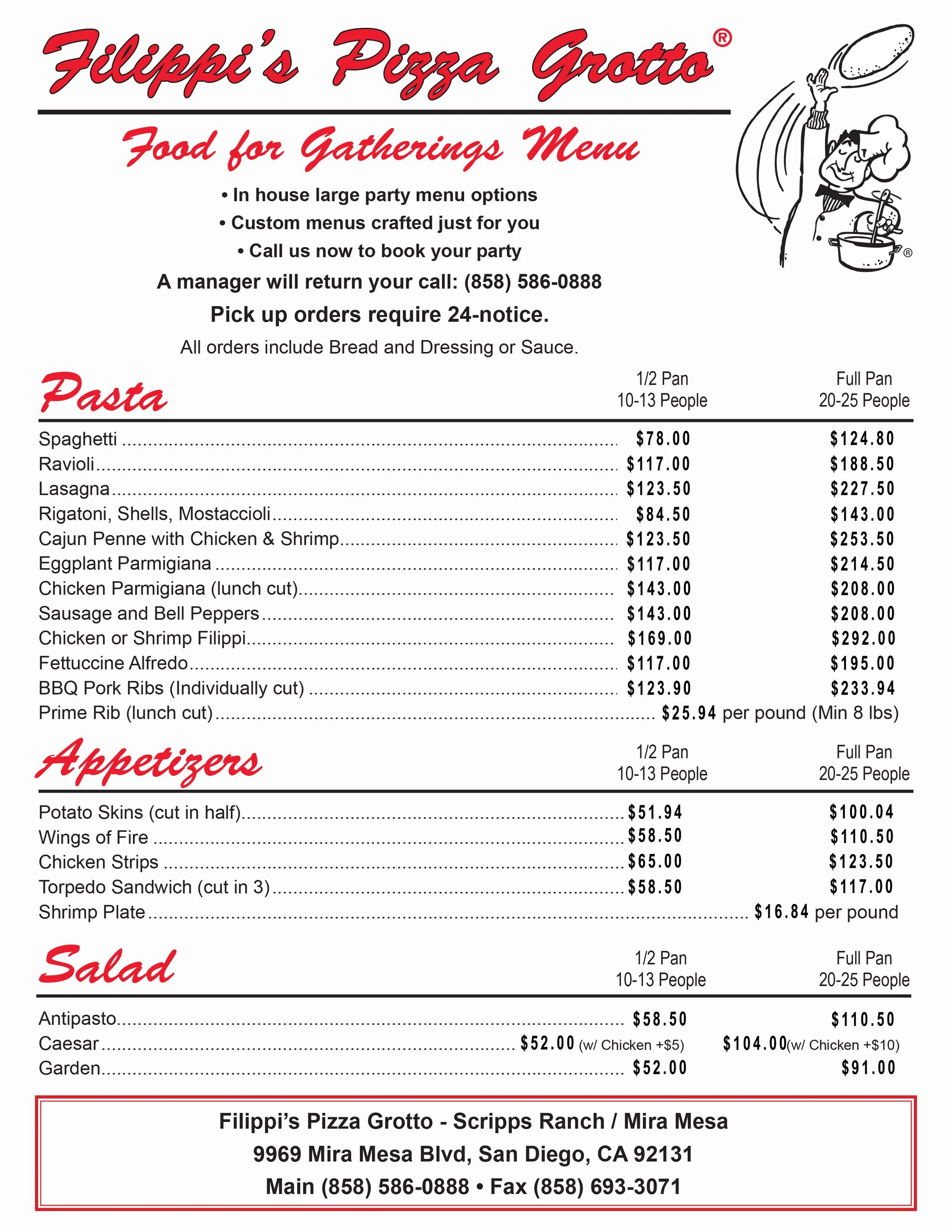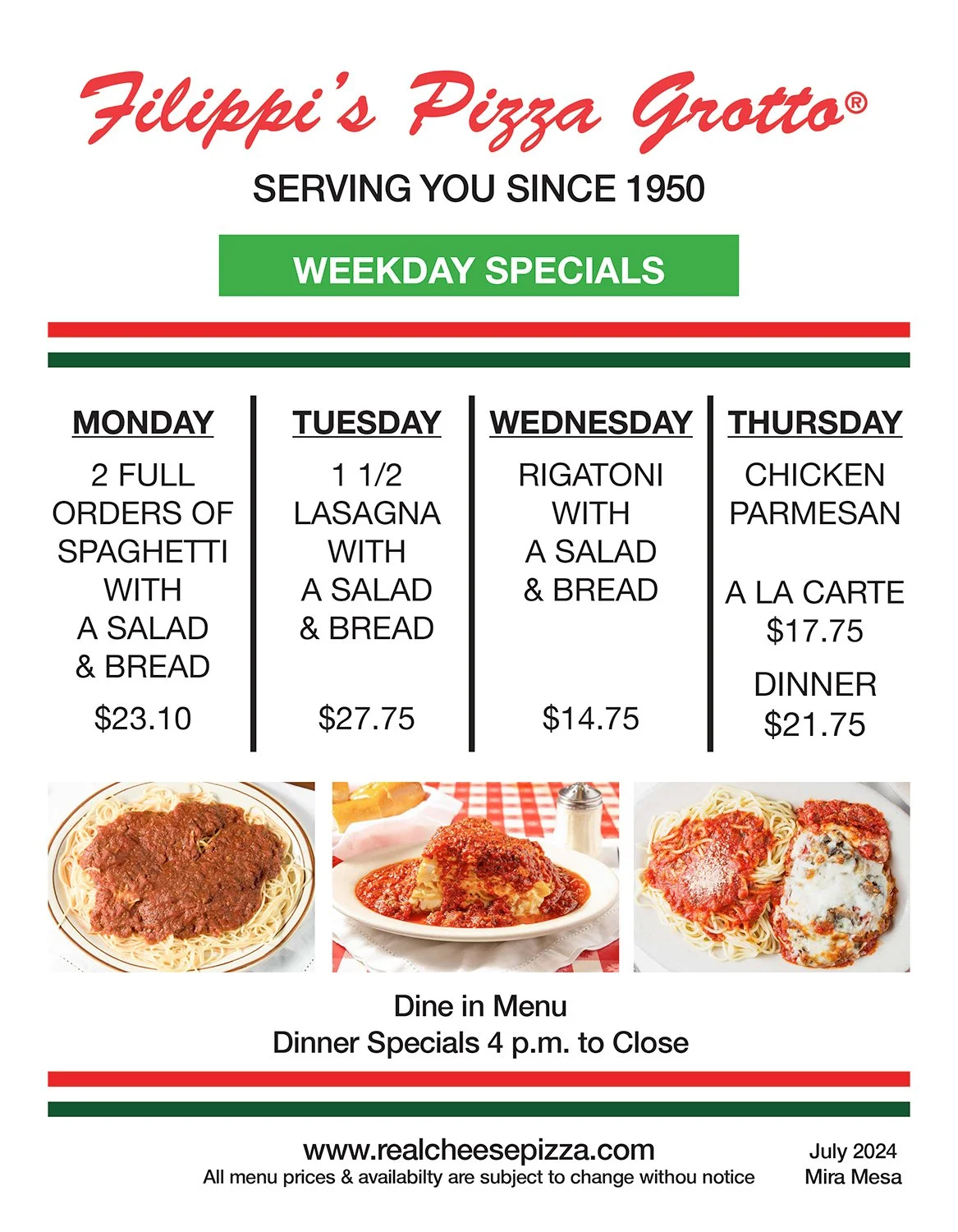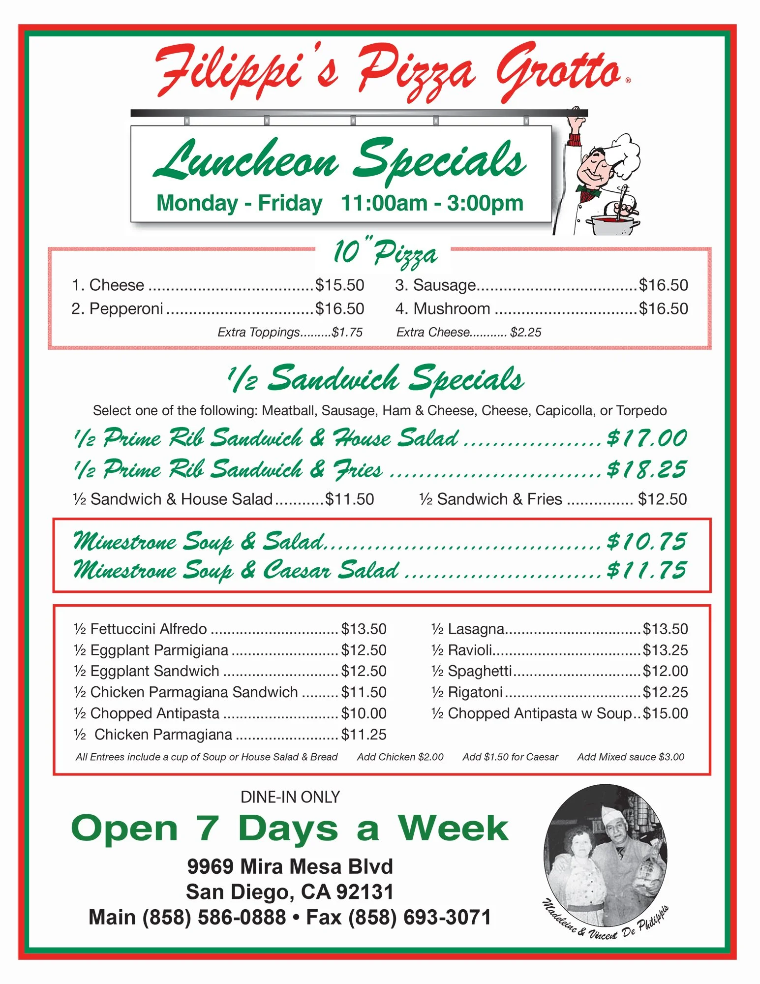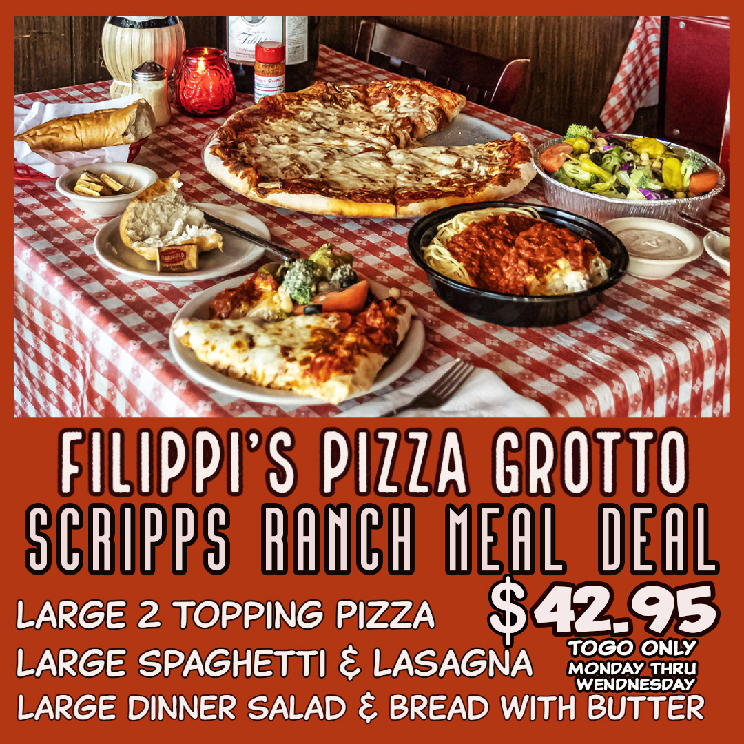 Filippis Pizza Grotto, San Diego, Little Italy, West Covina, Santee, Poway, Jamul, Napa, Chula Vista, Escondido, Kearny Mesa, Mission Gorge, Norco, Pacific Beach, Scripps Ranch, Mira Mesa, Imperial Beach, Temecula, Pizza, Spaghetti, Ravioli, Lasagna, Macaroni, Sandwiches, Antipasto Salad,