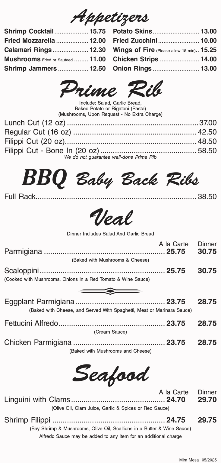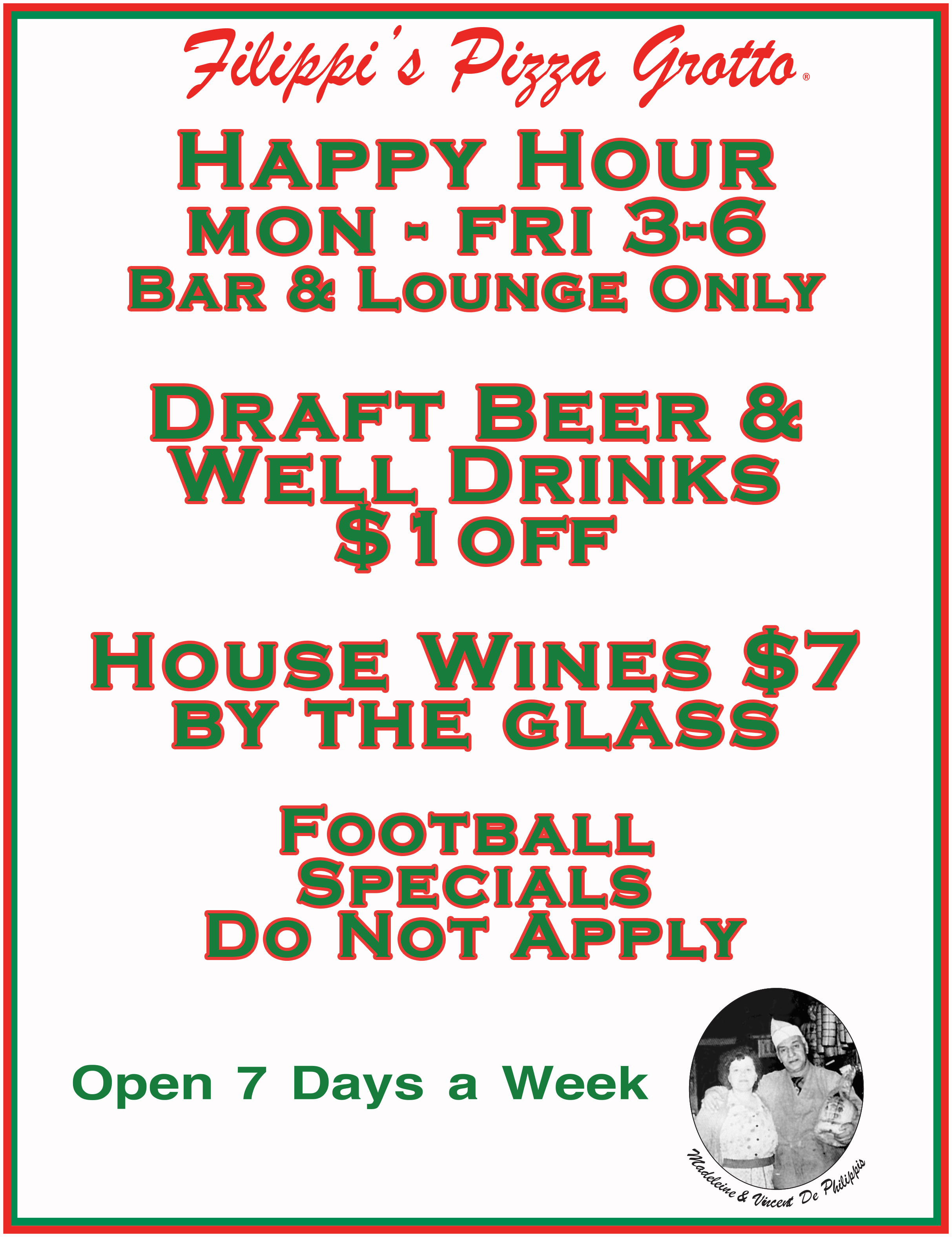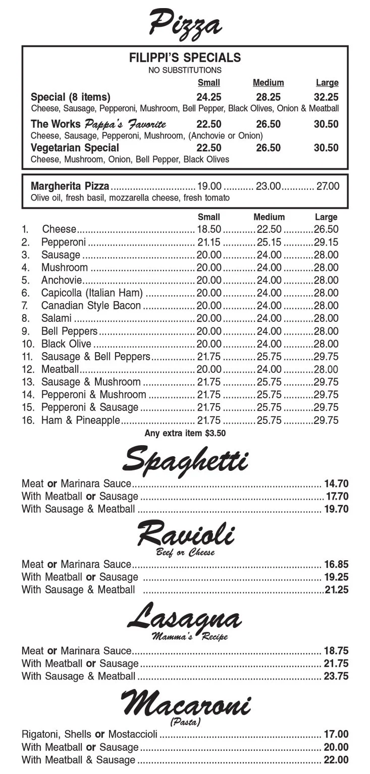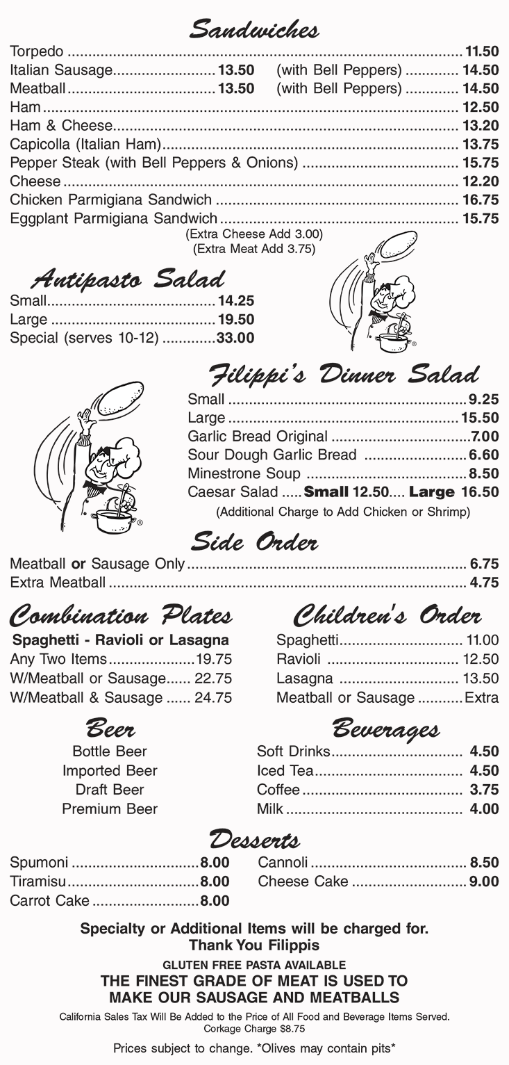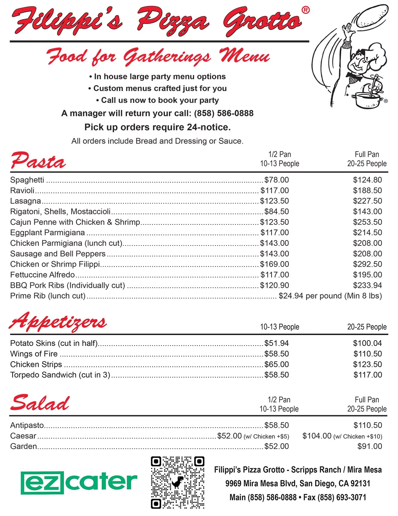 Filippis Pizza Grotto, San Diego, Little Italy, West Covina, Santee, Poway, Jamul, Napa, Chula Vista, Escondido, Kearny Mesa, Mission Gorge, Norco, Pacific Beach, Scripps Ranch, Mira Mesa, Imperial Beach, Temecula, Pizza, Spaghetti, Ravioli, Lasagna, Macaroni, Sandwiches, Antipasto Salad,