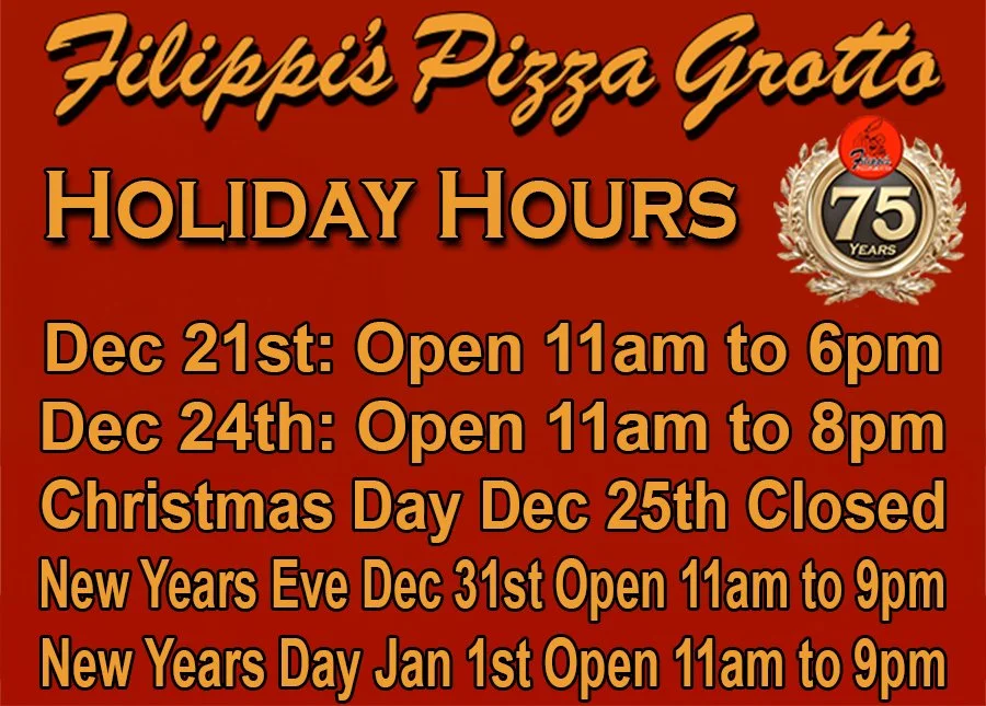 Filippis Pizza Grotto, San Diego, Little Italy, West Covina, Santee, Poway, Jamul, Napa, Chula Vista, Escondido, Kearny Mesa, Mission Gorge, Norco, Pacific Beach, Scripps Ranch, Mira Mesa, Imperial Beach, Temecula, Pizza, Spaghetti, Ravioli, Lasagna, Macaroni, Sandwiches, Antipasto Salad,