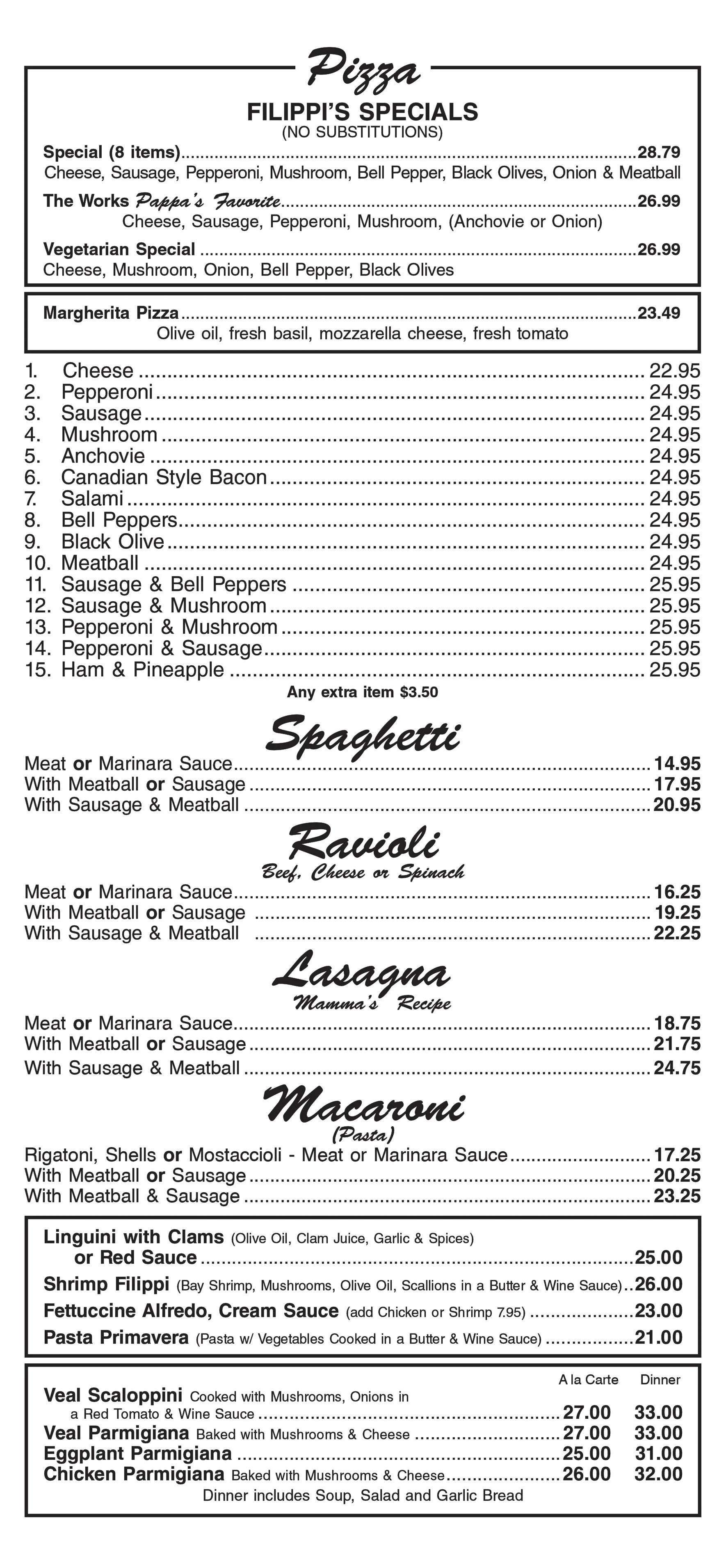 Filippis Pizza Grotto, San Diego, Little Italy, West Covina, Santee, Poway, Jamul, Napa, Chula Vista, Escondido, Kearny Mesa, Mission Gorge, Norco, Pacific Beach, Scripps Ranch, Mira Mesa, Imperial Beach, Temecula, Pizza, Spaghetti, Ravioli, Lasagna, Macaroni, Sandwiches, Antipasto Salad,