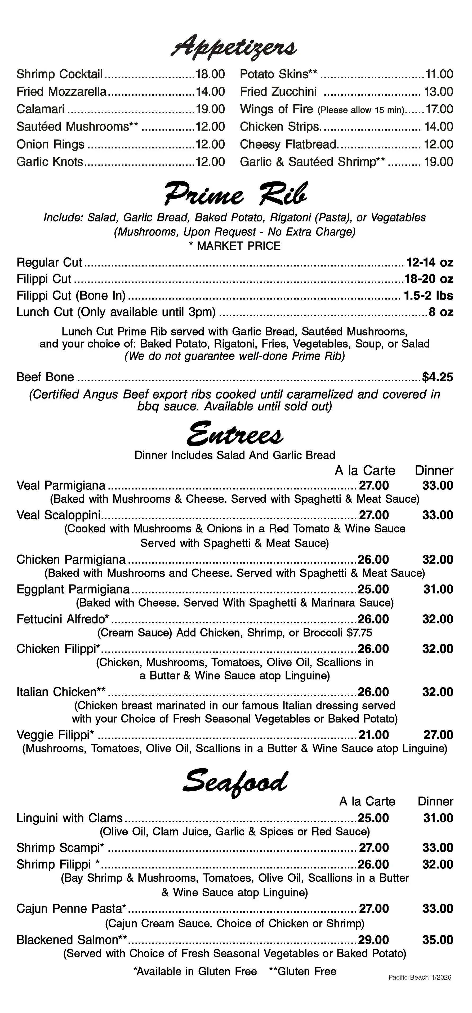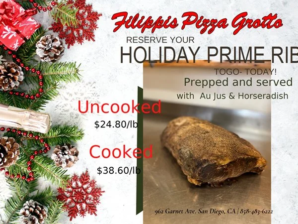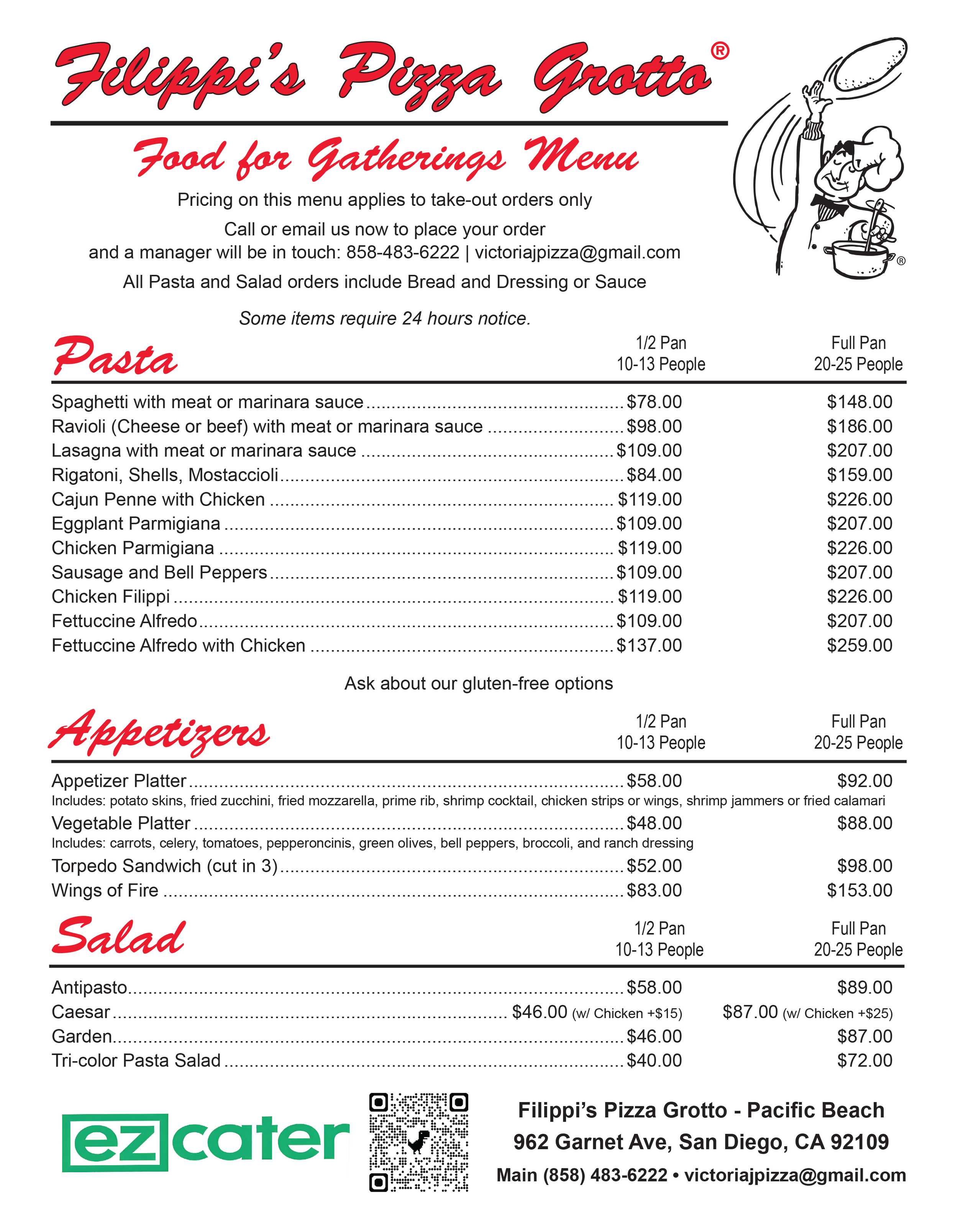 Filippis Pizza Grotto, San Diego, Little Italy, West Covina, Santee, Poway, Jamul, Napa, Chula Vista, Escondido, Kearny Mesa, Mission Gorge, Norco, Pacific Beach, Scripps Ranch, Mira Mesa, Imperial Beach, Temecula, Pizza, Spaghetti, Ravioli, Lasagna, Macaroni, Sandwiches, Antipasto Salad,