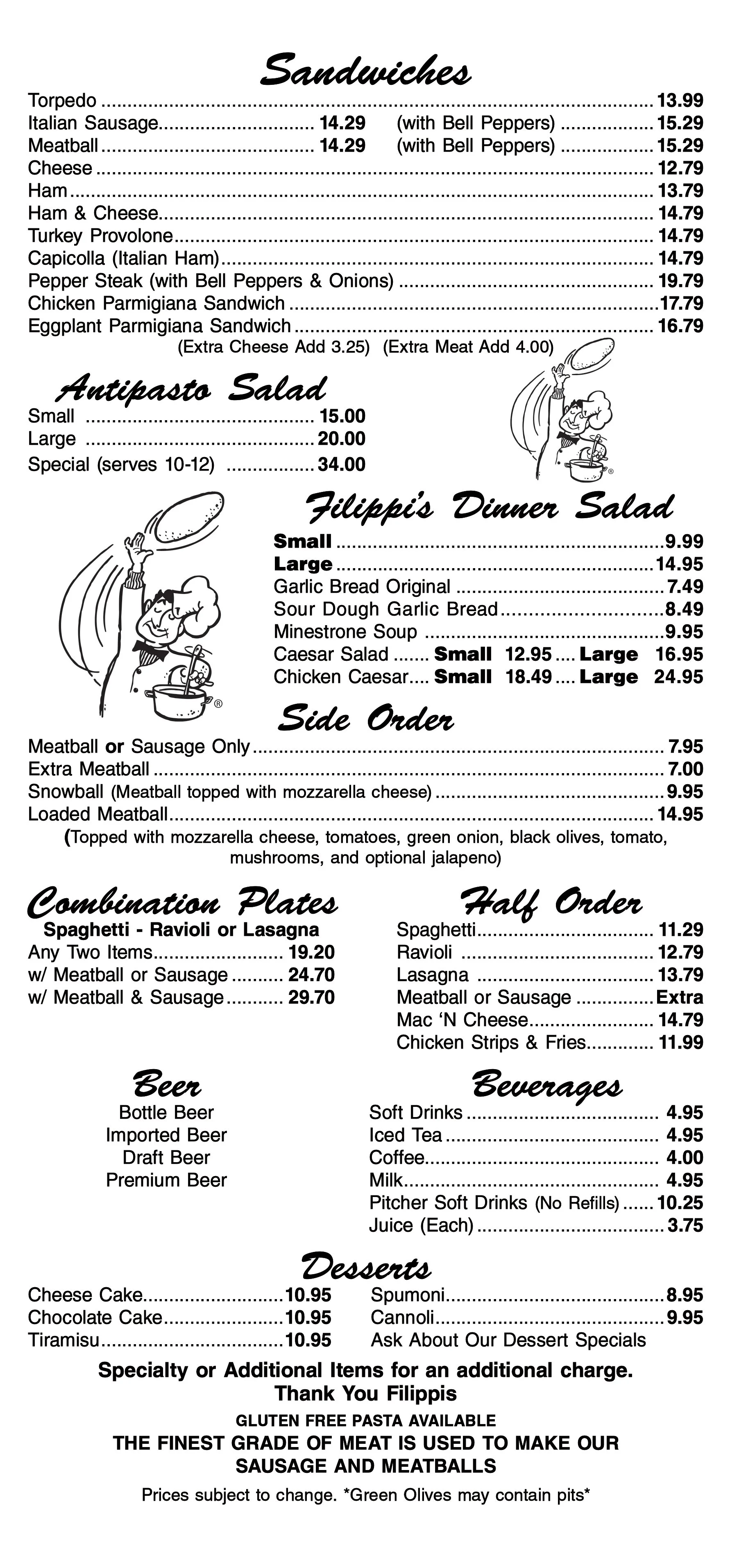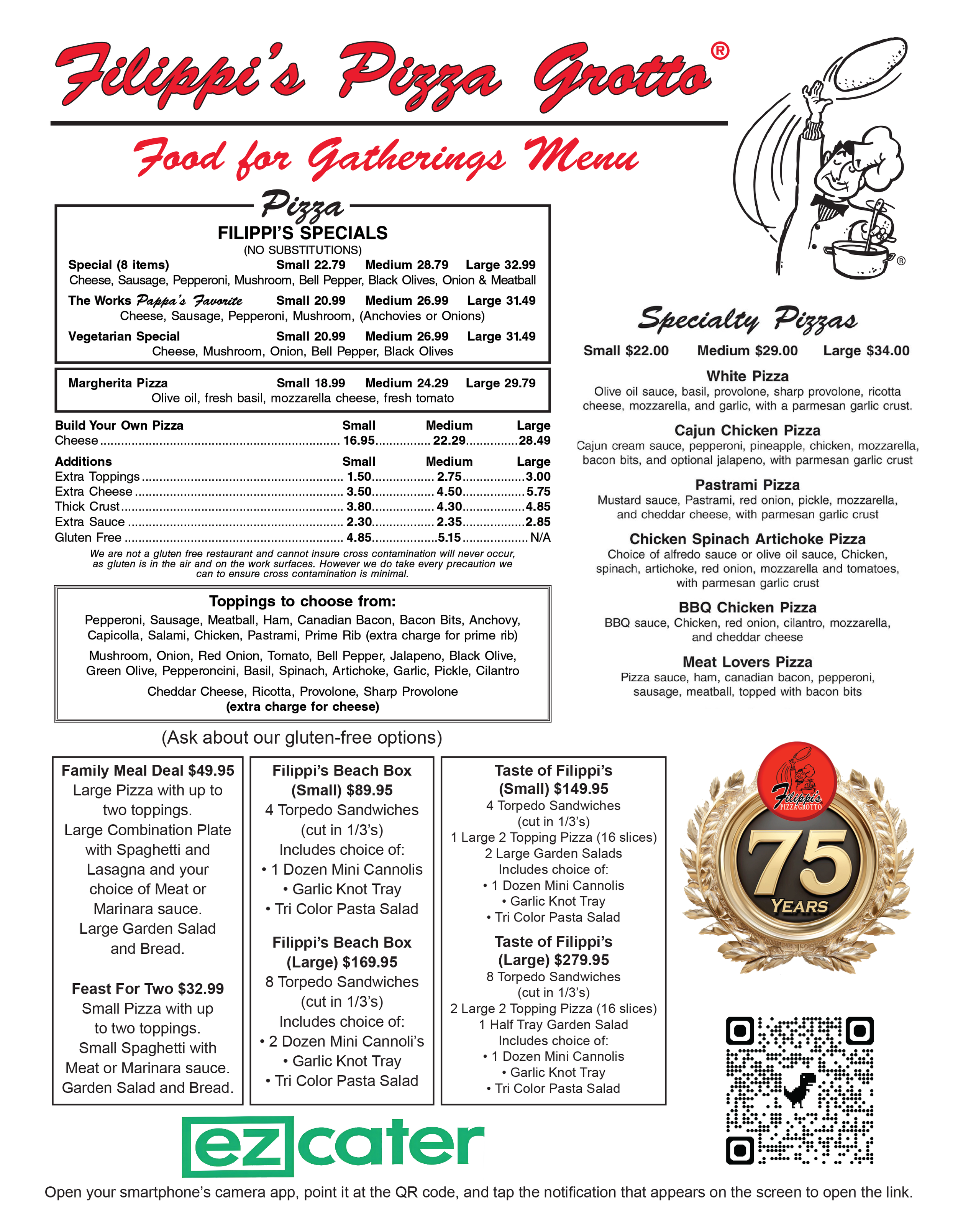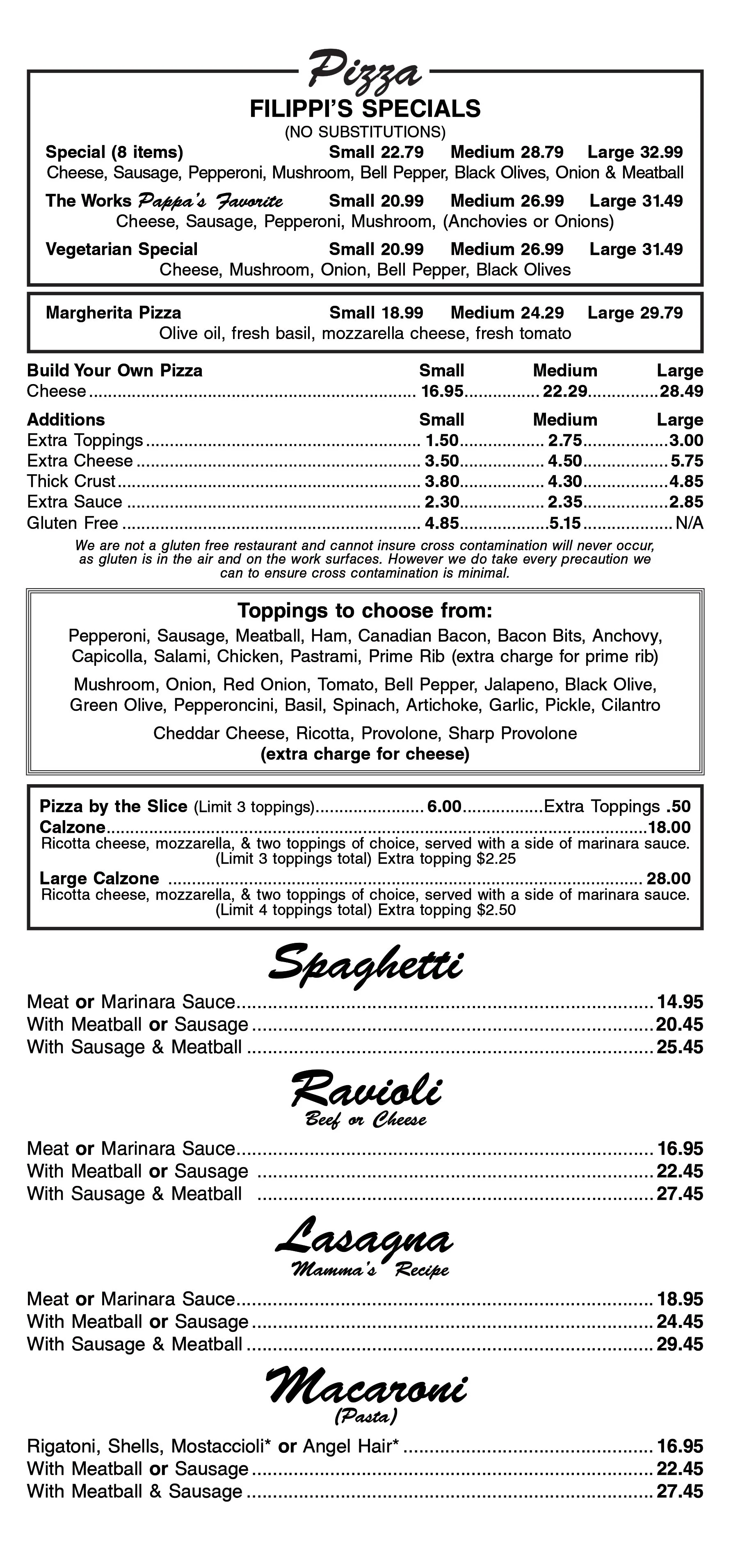 Filippis Pizza Grotto, San Diego, Little Italy, West Covina, Santee, Poway, Jamul, Napa, Chula Vista, Escondido, Kearny Mesa, Mission Gorge, Norco, Pacific Beach, Scripps Ranch, Mira Mesa, Imperial Beach, Temecula, Pizza, Spaghetti, Ravioli, Lasagna, Macaroni, Sandwiches, Antipasto Salad,