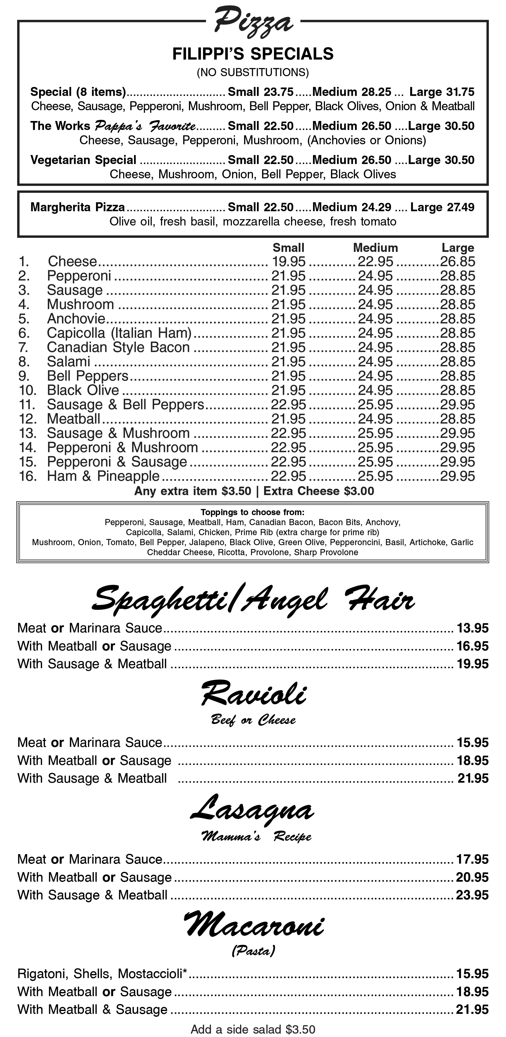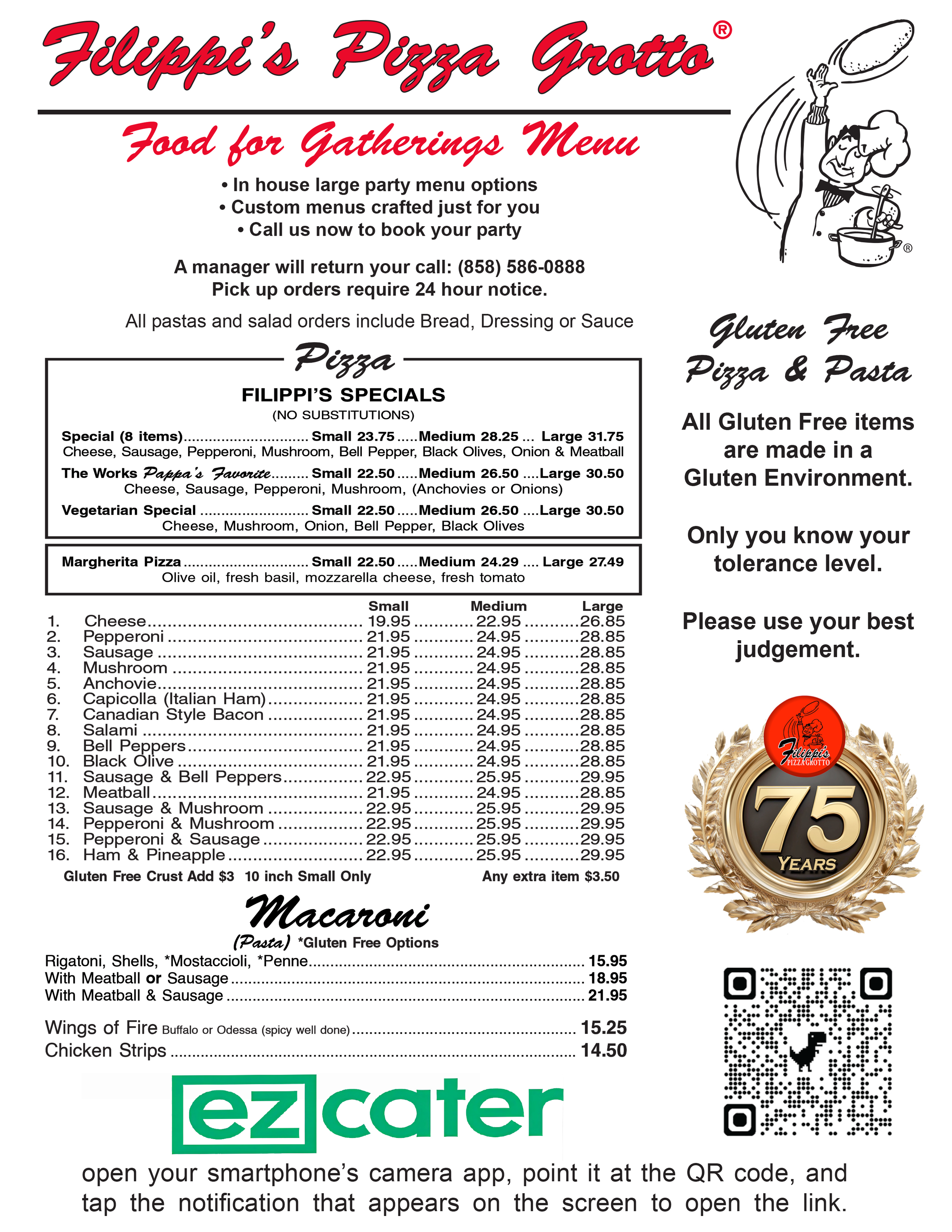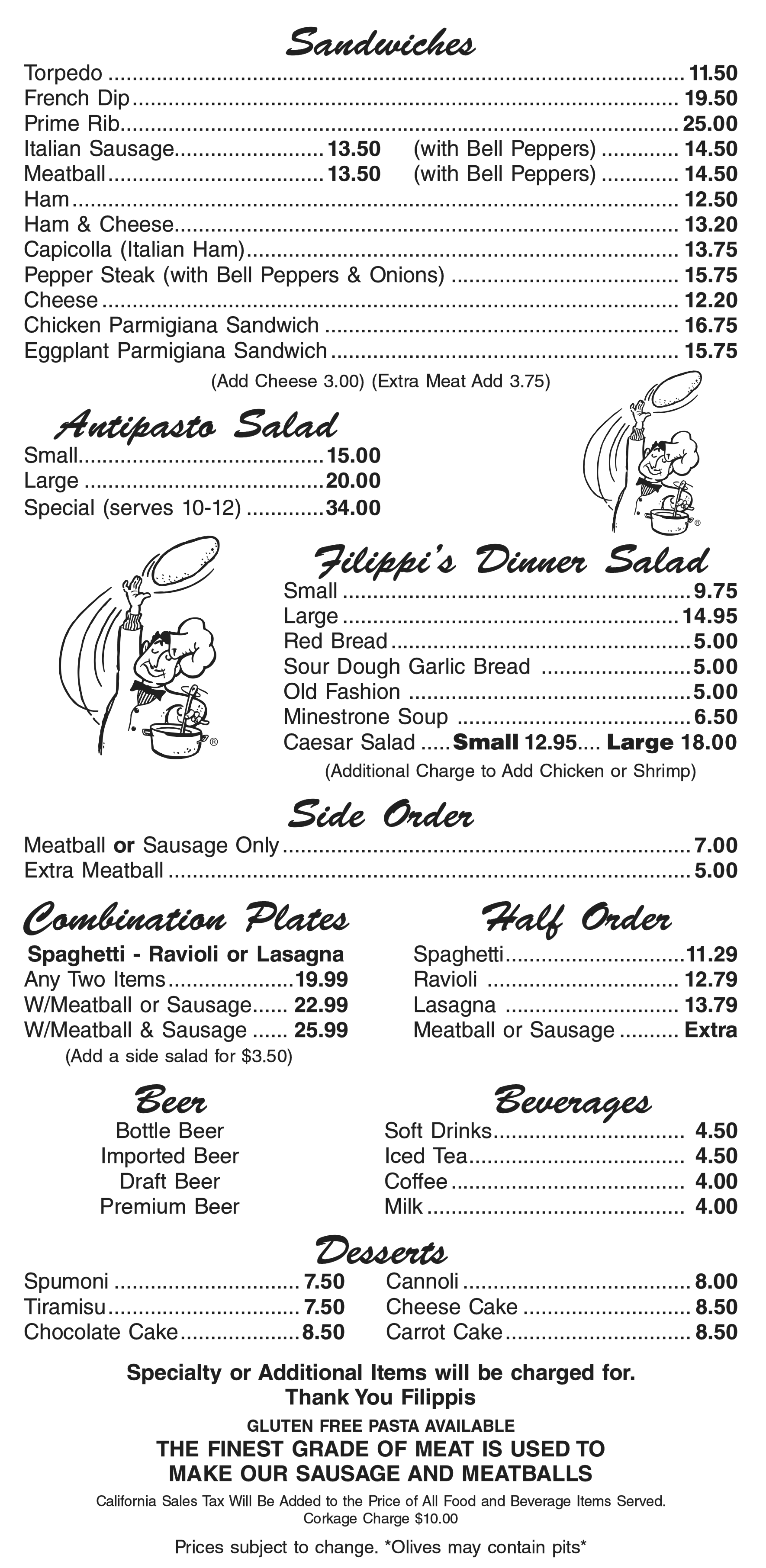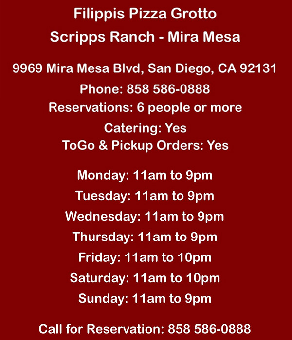 Filippis Pizza Grotto, San Diego, Little Italy, West Covina, Santee, Poway, Jamul, Napa, Chula Vista, Escondido, Kearny Mesa, Mission Gorge, Norco, Pacific Beach, Scripps Ranch, Mira Mesa, Imperial Beach, Temecula, Pizza, Spaghetti, Ravioli, Lasagna, Macaroni, Sandwiches, Antipasto Salad,